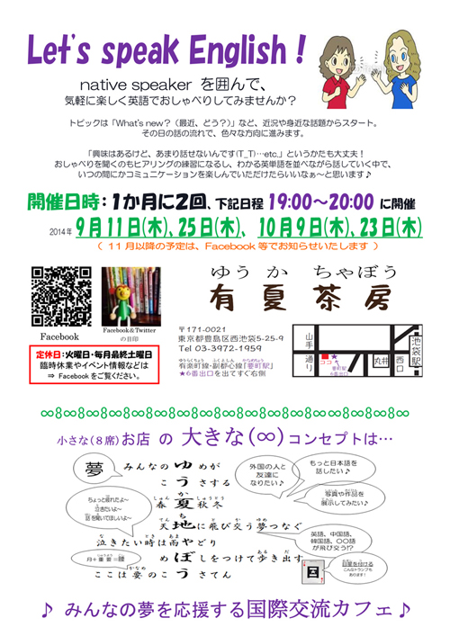 日本語教師仲間のSさんが、池袋で「国際交流カフェ・有夏茶房(ゆうかちゃぼう)」を始めました。