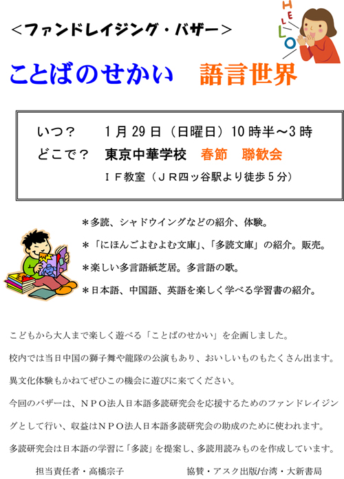 水餃子や大根餅を始め、おいしい料理もたくさんありますので(陳建一のブースもあるとか?)、お近くの方、気軽にお立ち寄り下さい。また、不要になった絵本や児童書などをお持ちいただき、バザーに出品していただけたら、ありがたいです(売れなかった場合はお引き取りいただくのが条件ですが)。チラシを添付します。