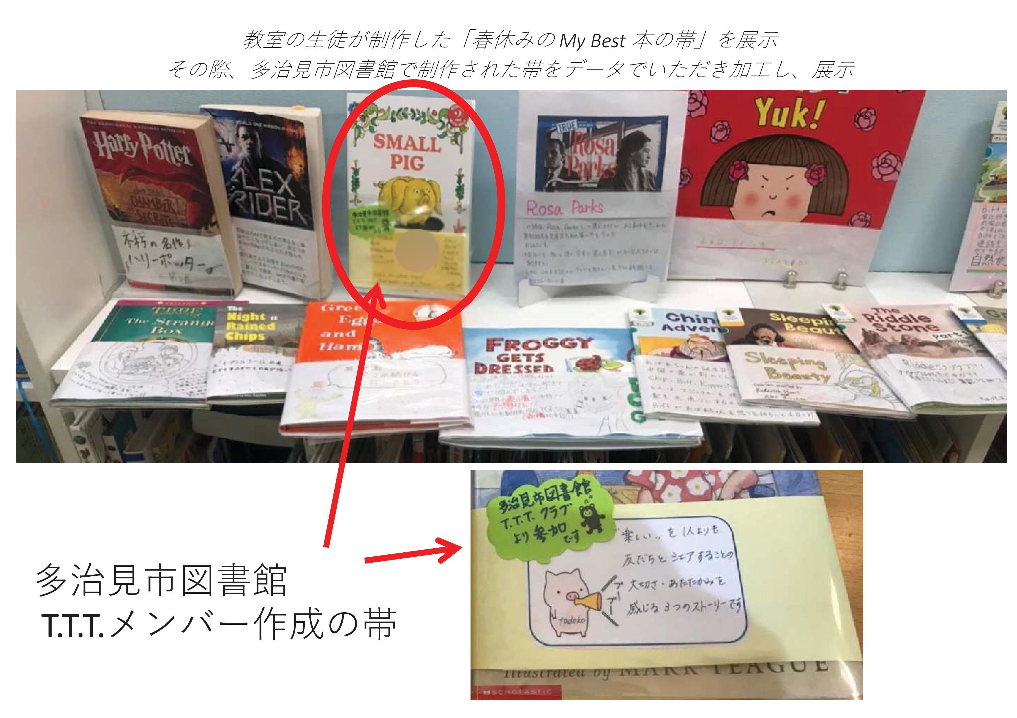 教室の生徒たちが制作した「春休みの My Best 本の帯」を展示する中に、